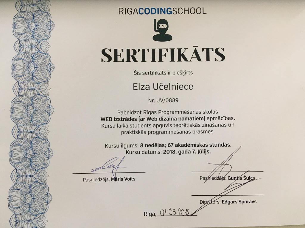 Riga Coding School WEB DEVELOPMENT COURSE 06.2018 – 08.2018 Learned how to develop a Web page by using HTML/CSS, CSS preprocessors, Javascript, PHP, SQL, DB, Adobe Photoshop, Adobe Illustrator, Git/Version control (Github, gitlab).